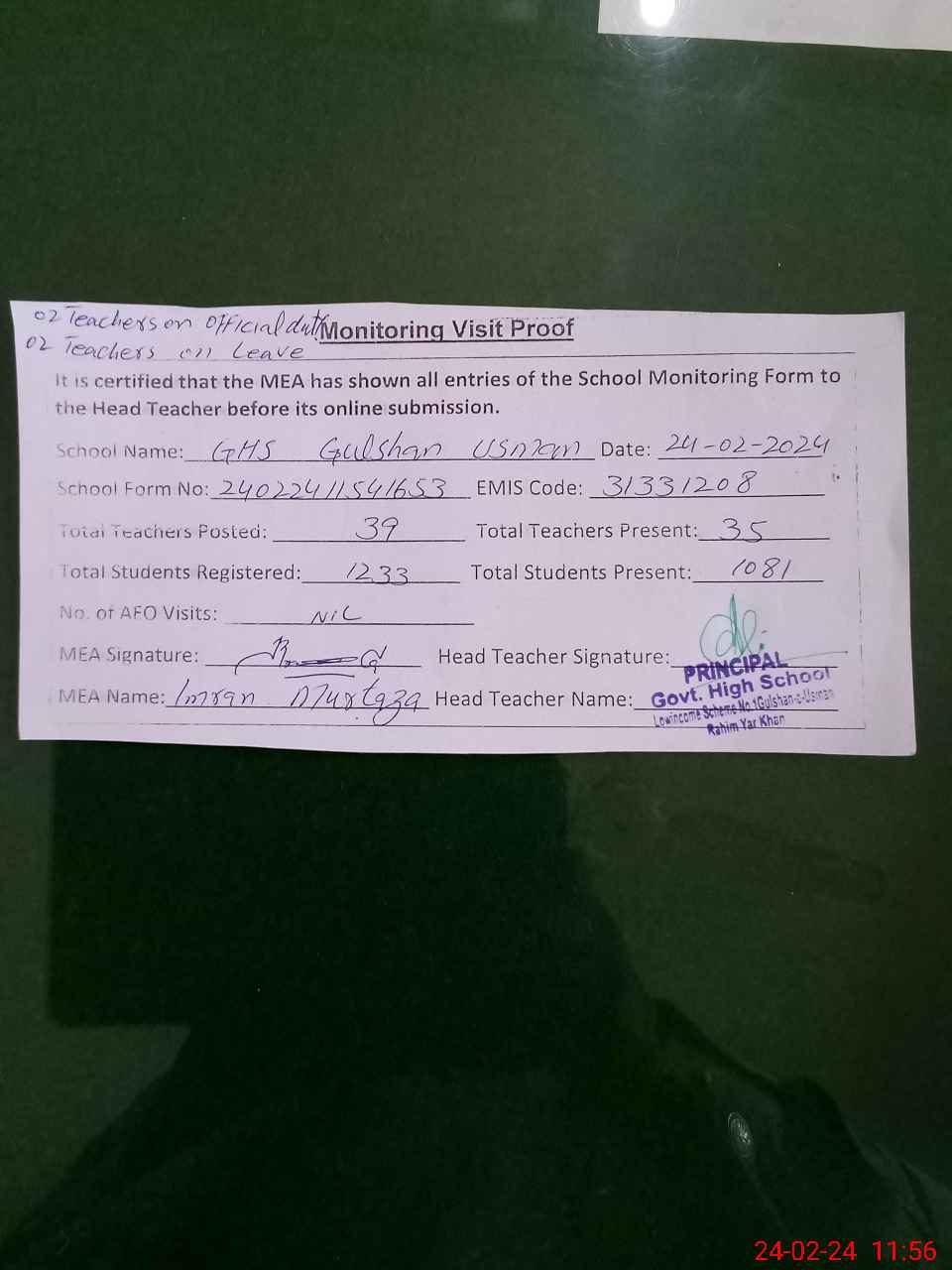 | EMIS Code: 31331208 | Name of School: GHS GULSHAN USMAN | |||