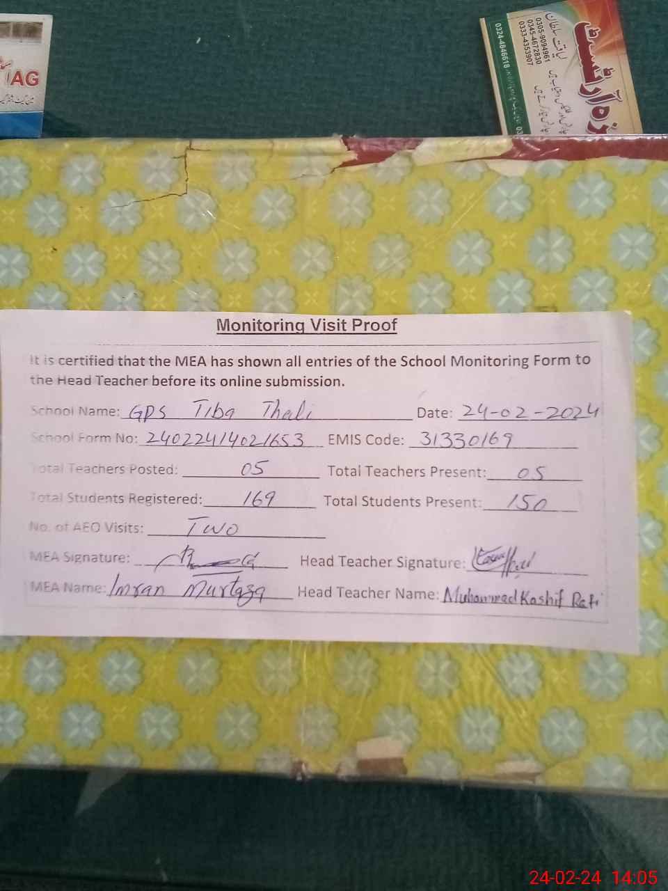 | Attendance Register | Head Teacher | MEA with School | Visit Proof |