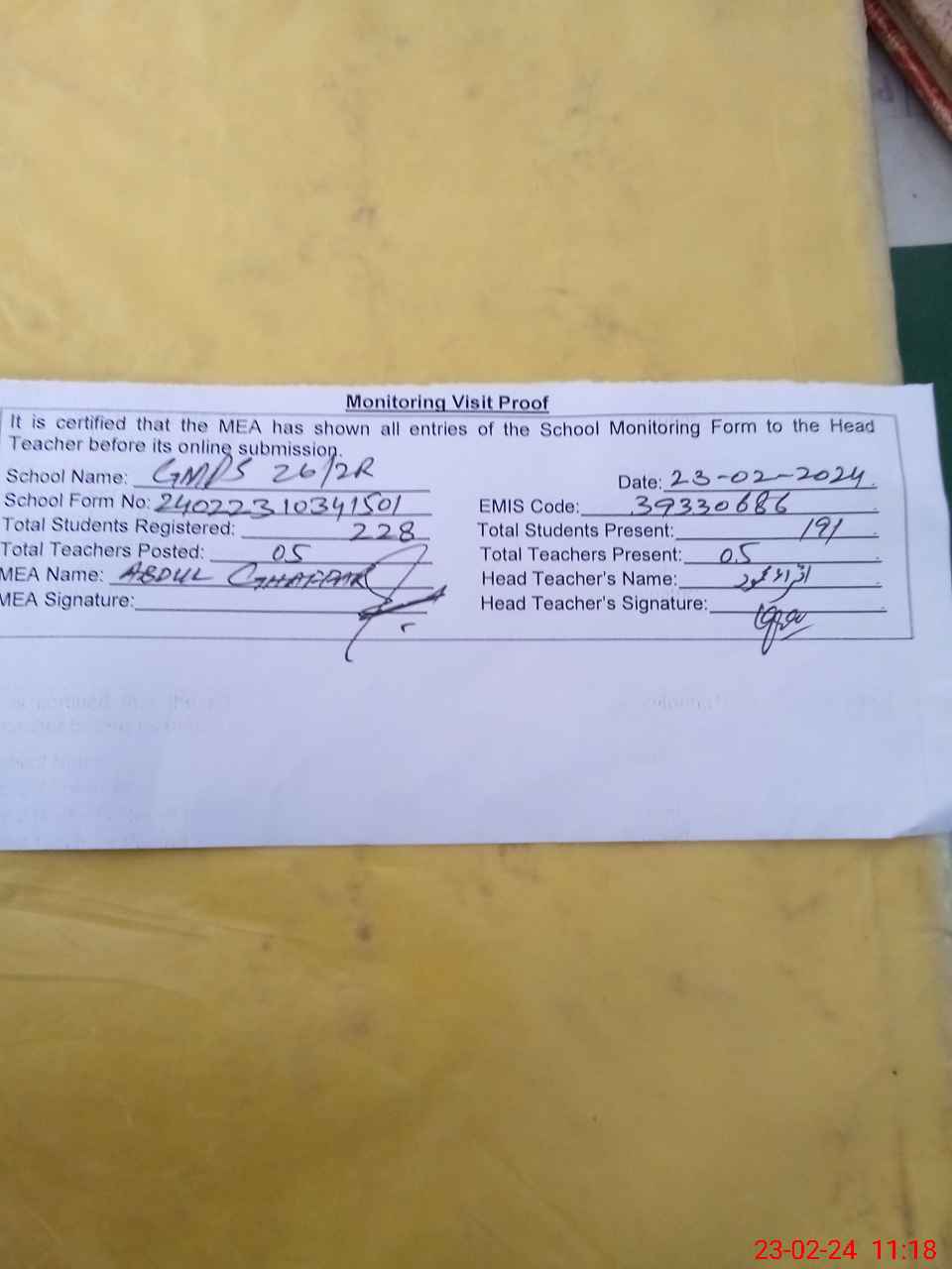 | Attendance Register | Head Teacher | MEA with School | Visit Proof |