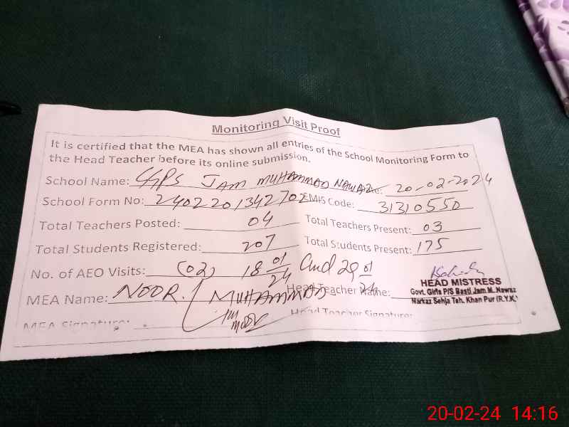 | Certified that this School was Inspected by the Undersigned MEA/DMO Today and the Information Stated Above is as Per Record. | |||||