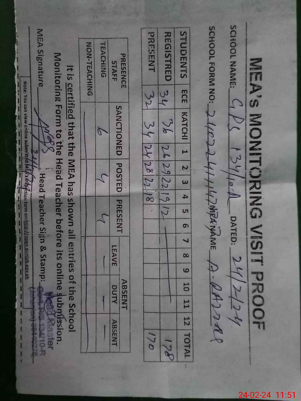 | Attendance Register | Head Teacher | MEA with School | Visit Proof |
