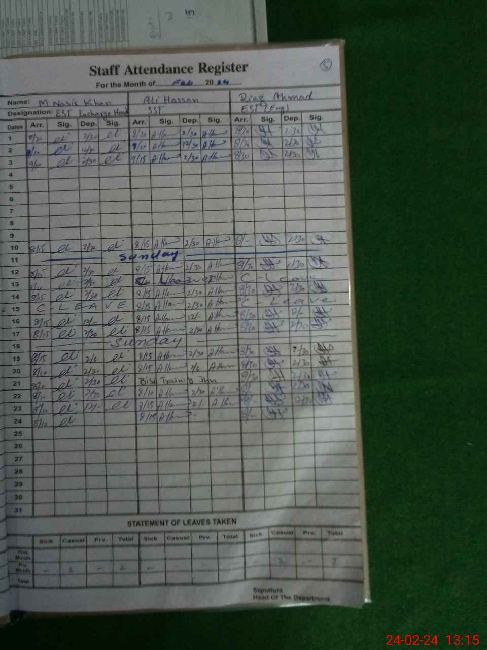 | CNIC | Full Name | Designation | R/C | Absence During Last Calender Month |