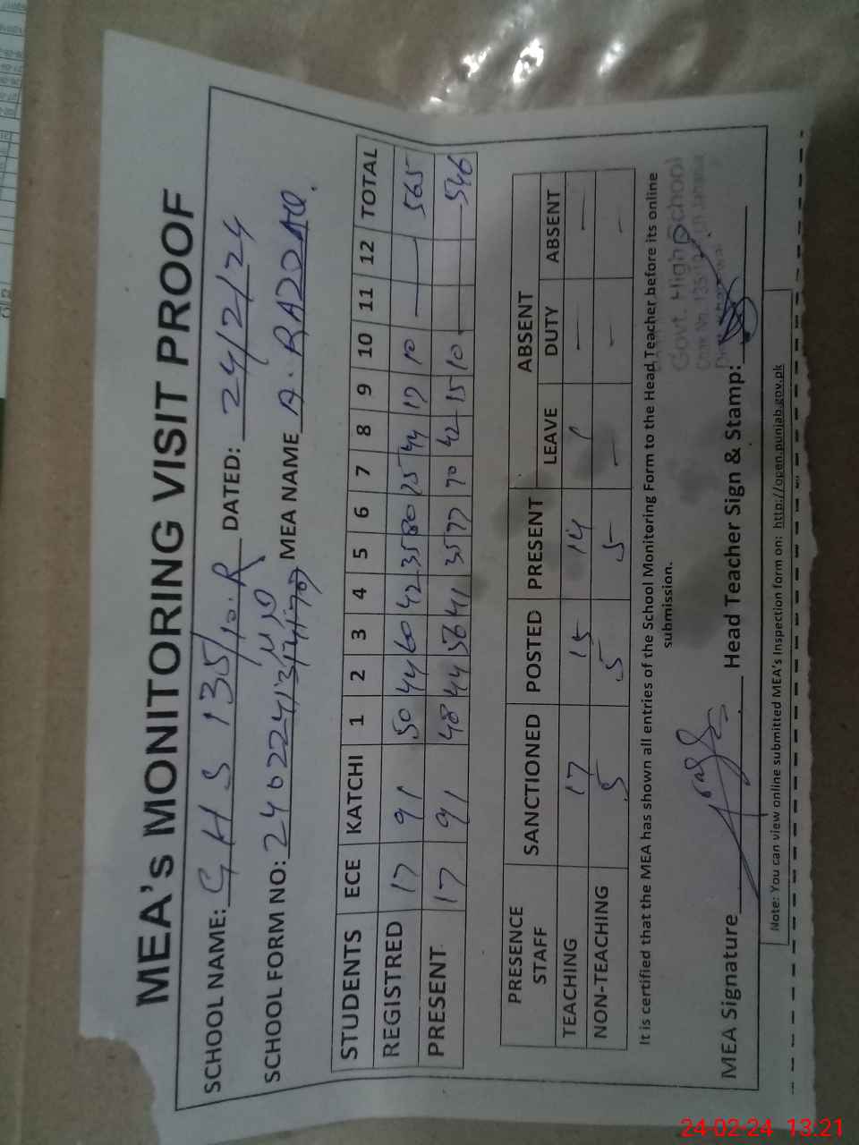 | Attendance Register | Head Teacher | MEA with School | Visit Proof |