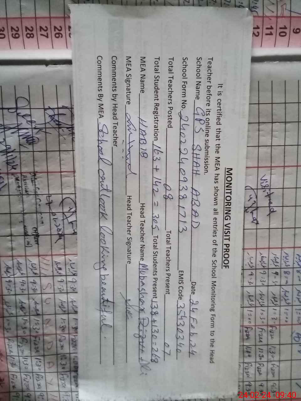 | Attendance Register | Head Teacher | MEA with School | Visit Proof |