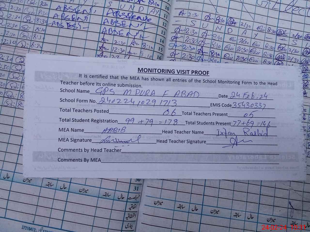 | Attendance Register | Head Teacher | MEA with School | Visit Proof |