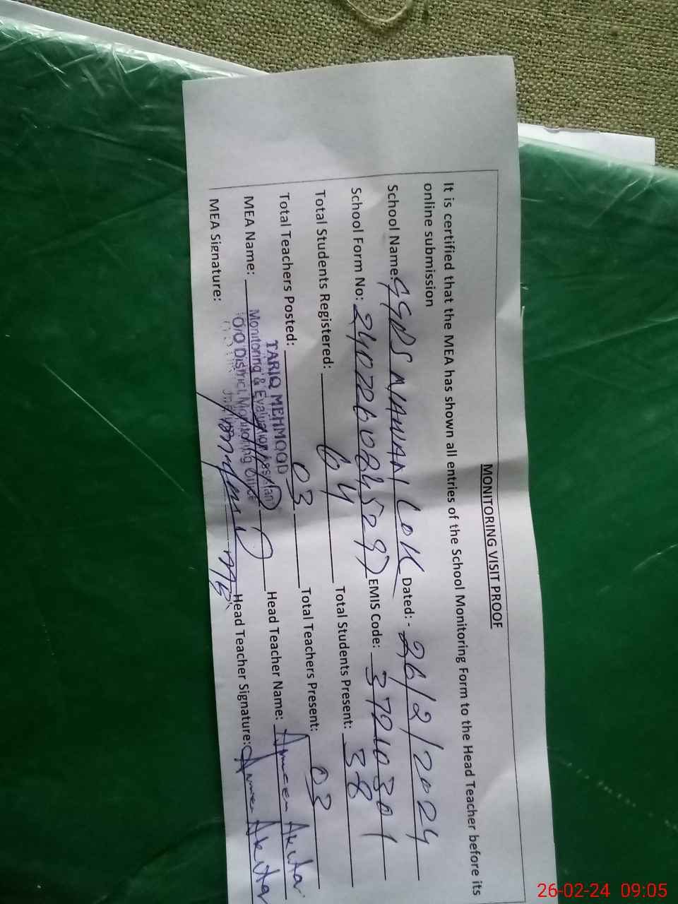 | Certified that this School was Inspected by the Undersigned MEA/DMO Today and the Information Stated Above is as Per Record. | |||||