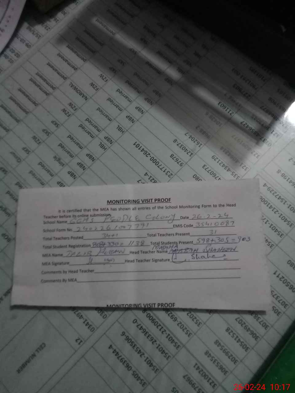 | Attendance Register | Head Teacher | MEA with School | Visit Proof |