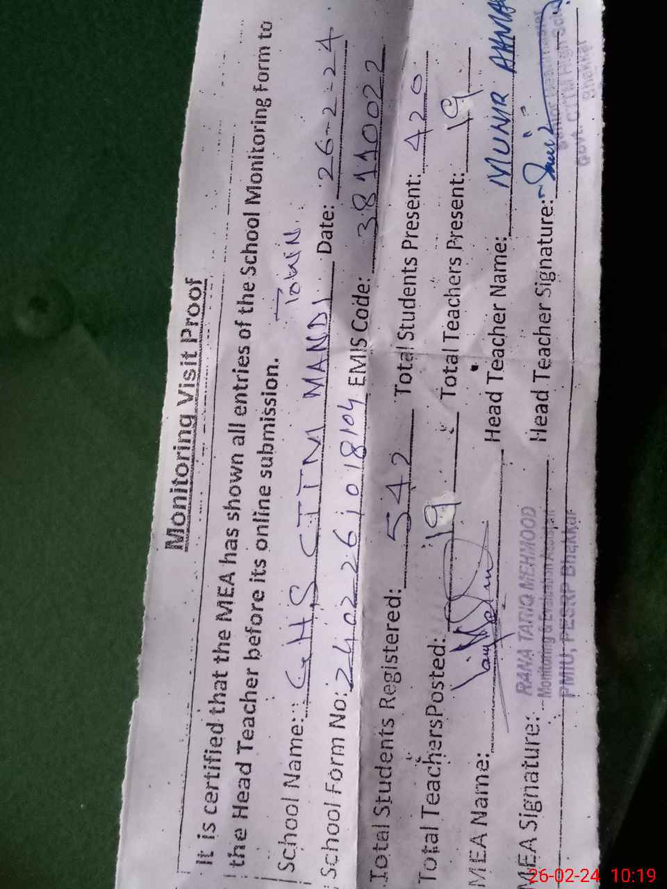 | Certified that this School was Inspected by the Undersigned MEA/DMO Today and the Information Stated Above is as Per Record. | |||||
