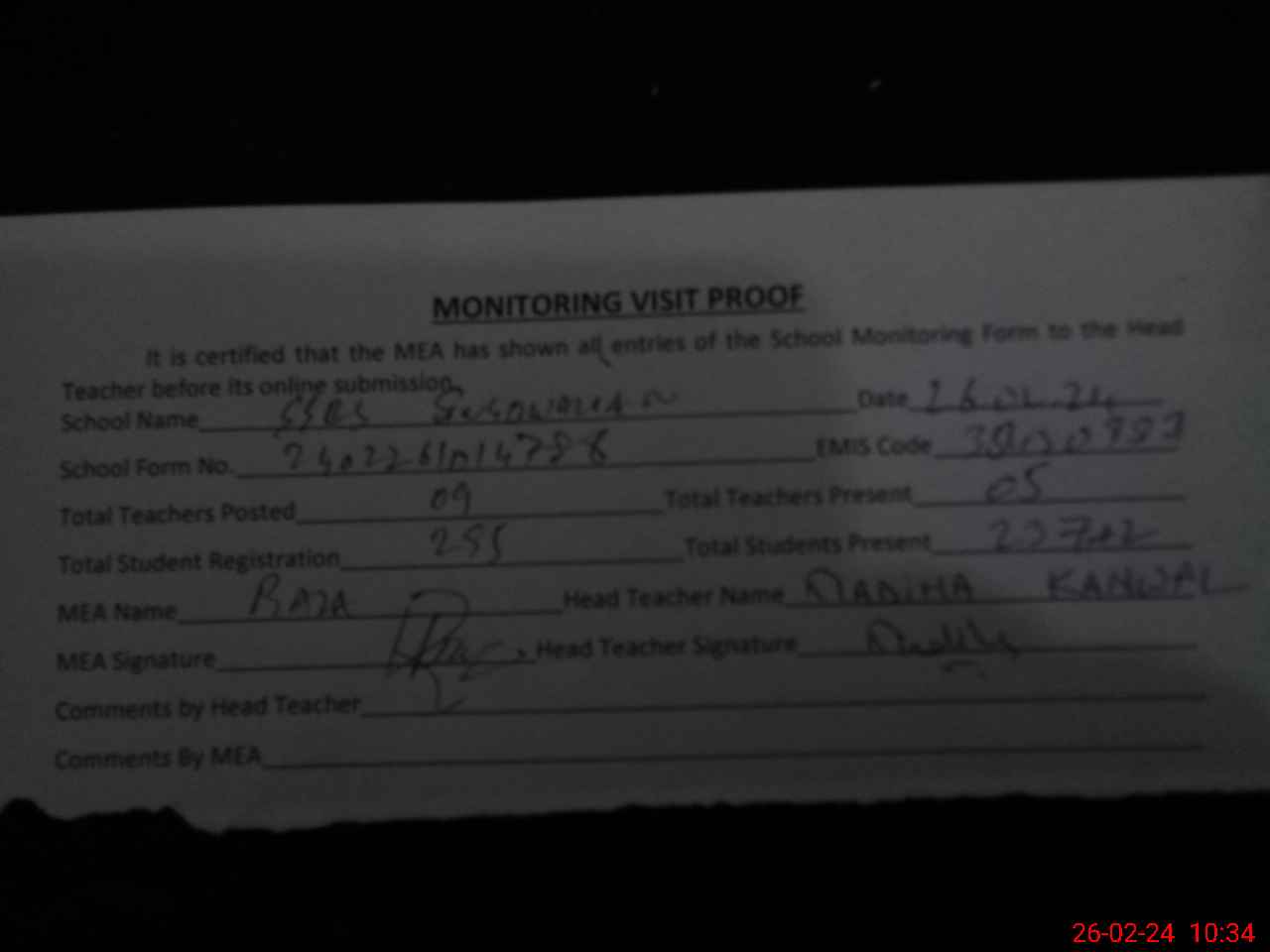 | Attendance Register | Head Teacher | MEA with School | Visit Proof |