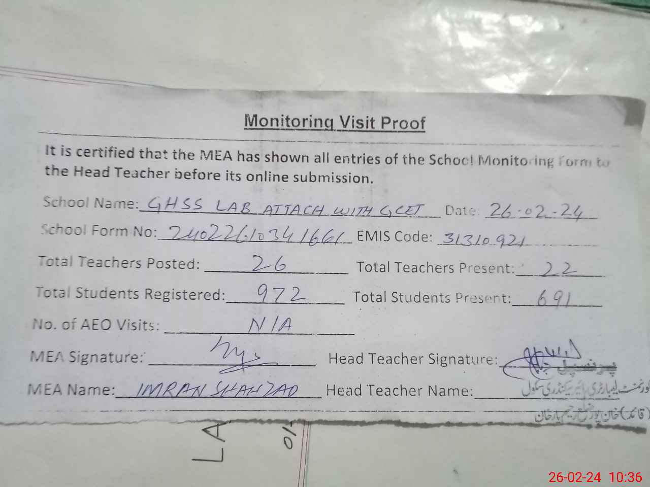 | EMIS Code: 31310921 | Name of School: GHSS LAB. (ATTACH WITH GCET) KHANPUR | |||