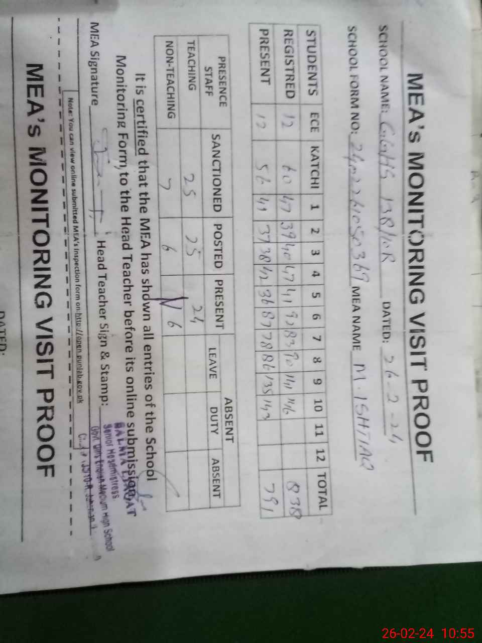 | Certified that this School was Inspected by the Undersigned MEA/DMO Today and the Information Stated Above is as Per Record. | |||||