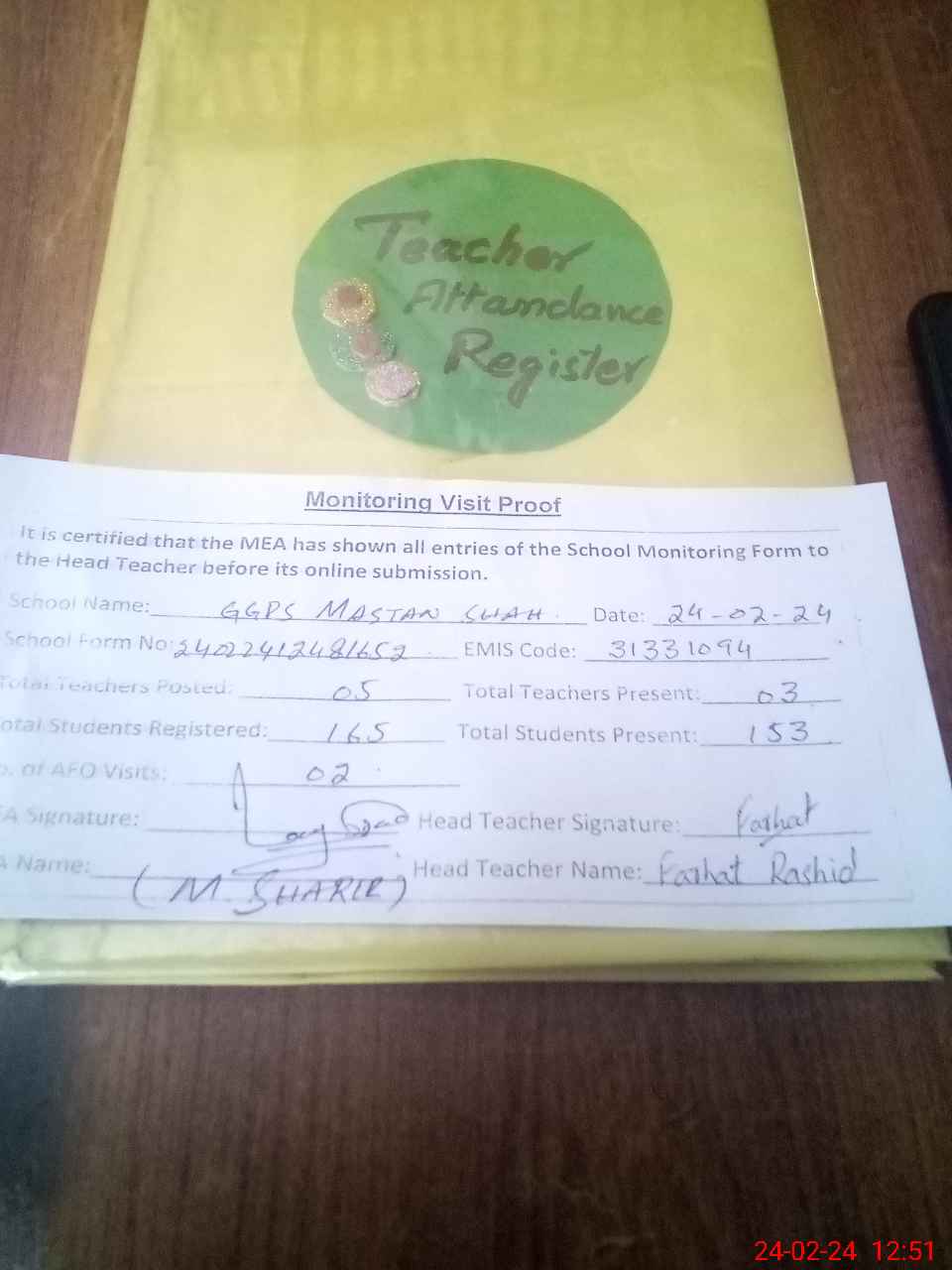 | Attendance Register | Head Teacher | MEA with School | Visit Proof |