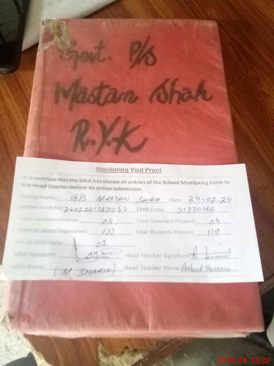 | Attendance Register | Head Teacher | MEA with School | Visit Proof |