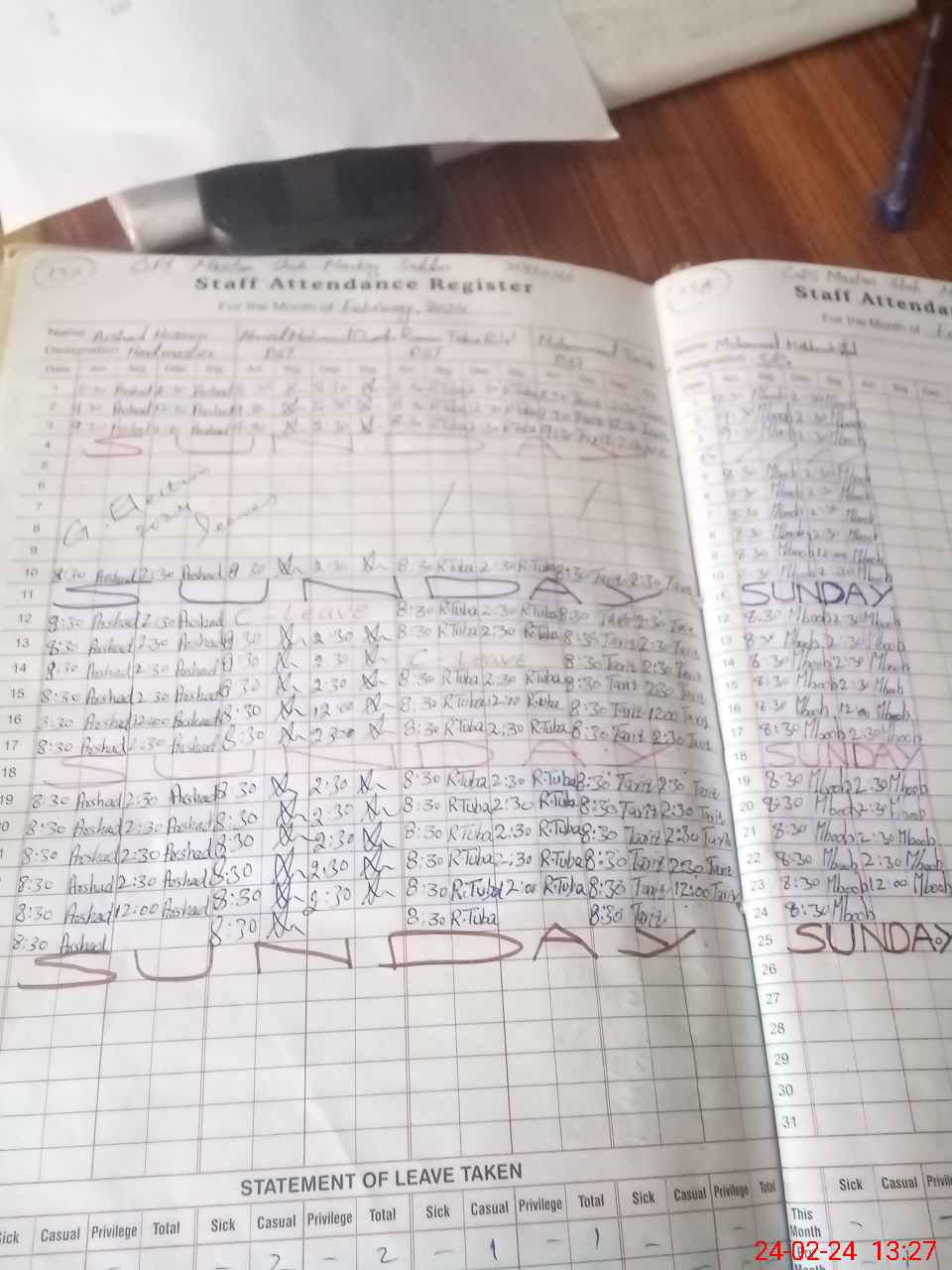 | Leave | Duty | Absent | Maternity | Medical | Ex- Pak |