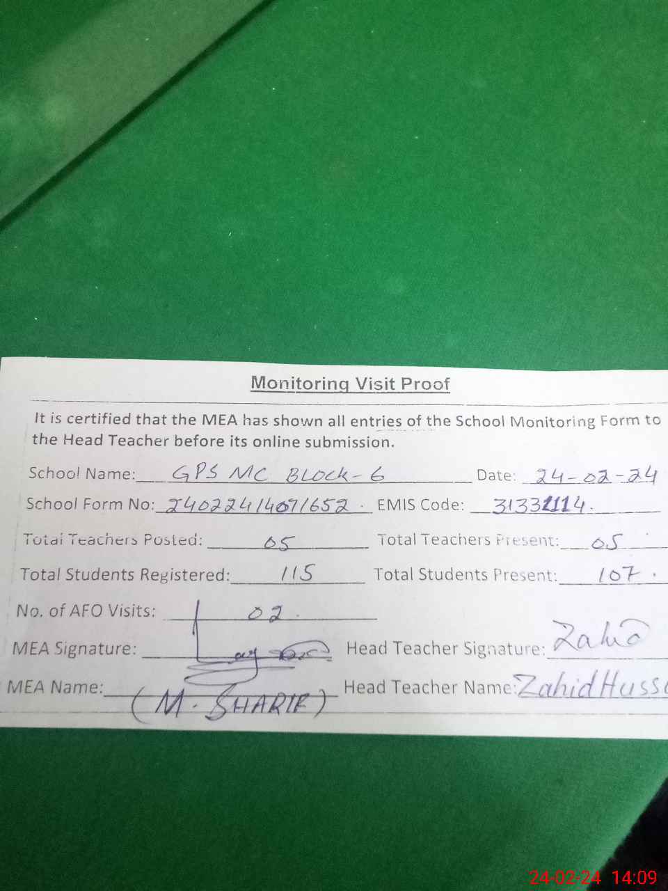 | EMIS Code: 31331114 | Name of School: GPS MC BLOCK NO. 6 RYK | |||