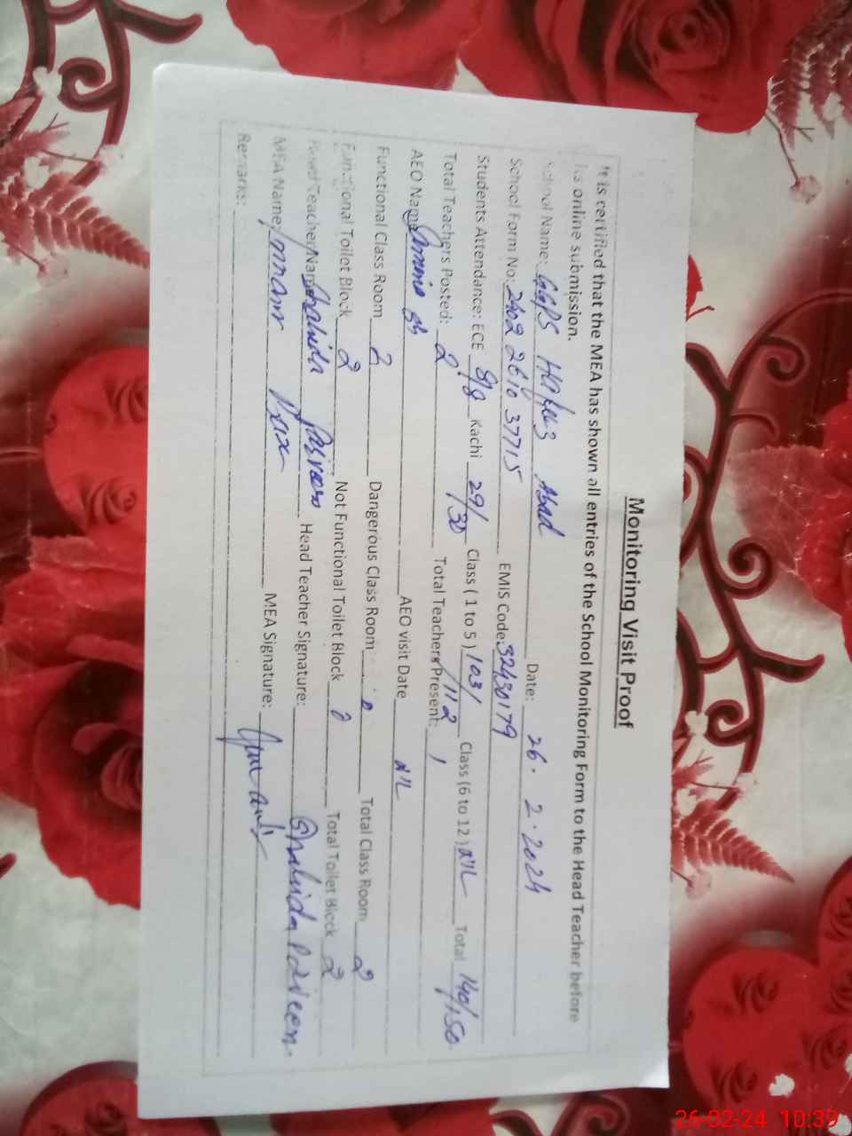 | Attendance Register | Head Teacher | MEA with School | Visit Proof |