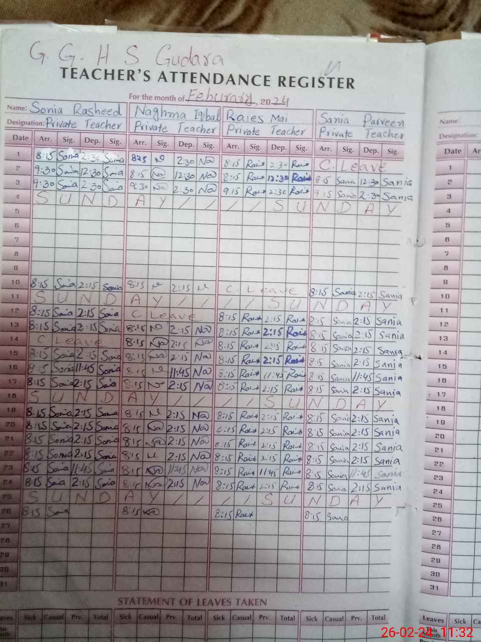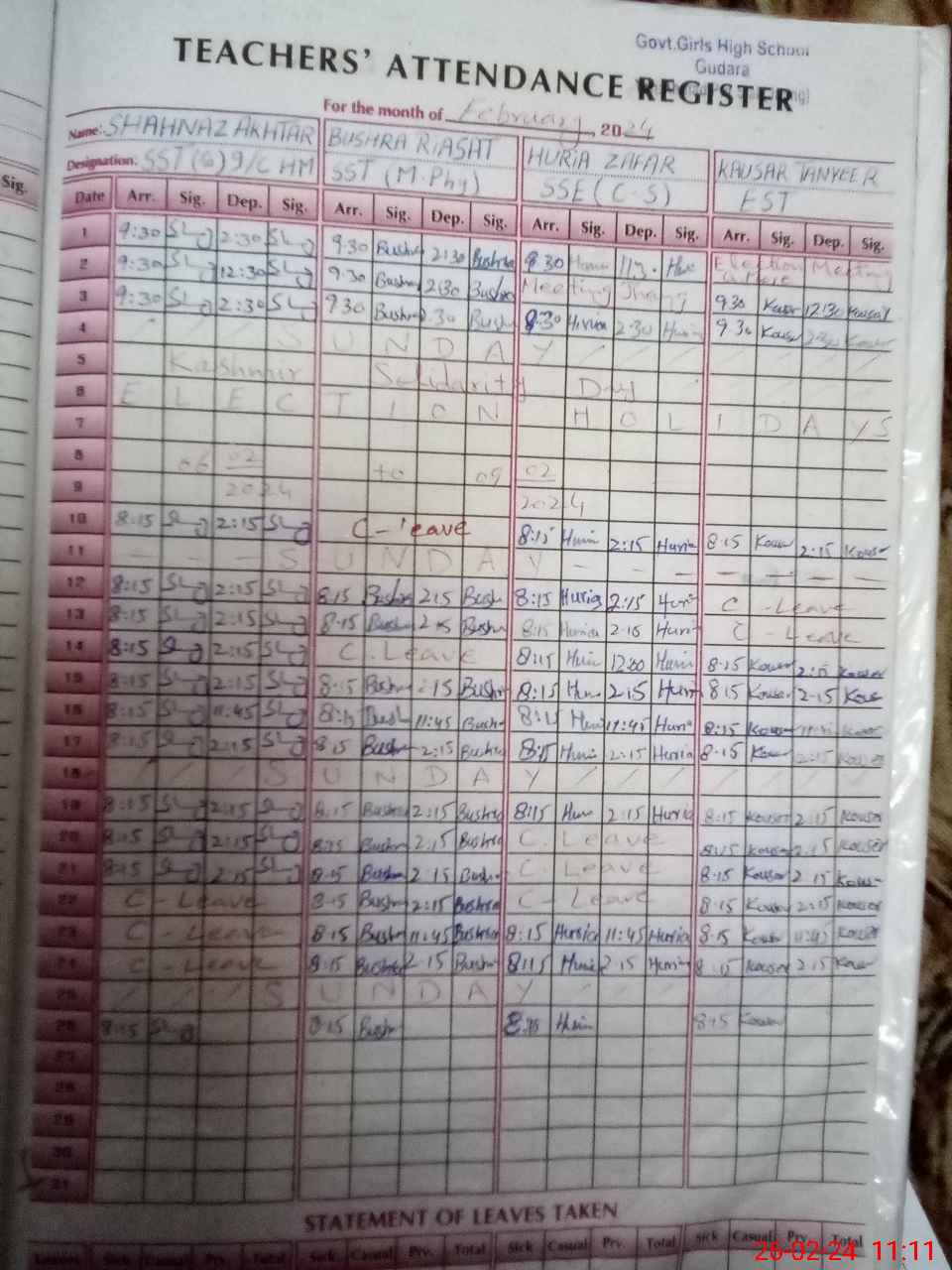 | No. of Students Present - Female | 26 | 0 | 12 | 19 | 15 | 15 | 30 | 23 | 27 | 28 | 32 | 55 | 40 | 322 | ||
