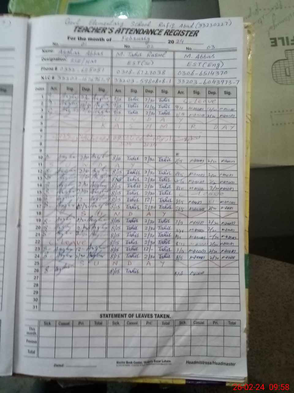 | Name: Ra**** Al**** Designation: (School Headmaster's/Headmistress's) EST Phone/Cell Number: 03**** |