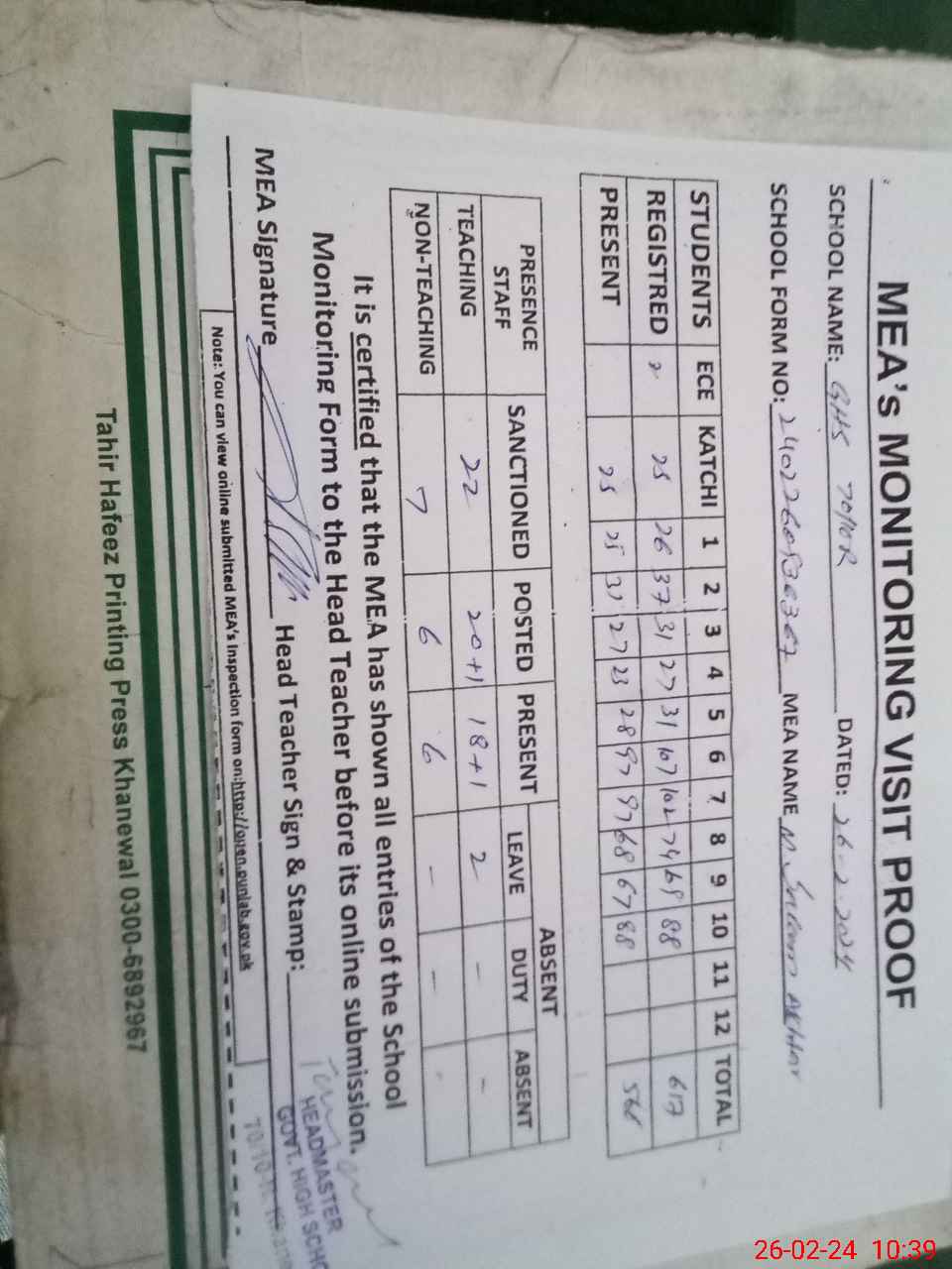 | Certified that this School was Inspected by the Undersigned MEA/DMO Today and the Information Stated Above is as Per Record. | |||||