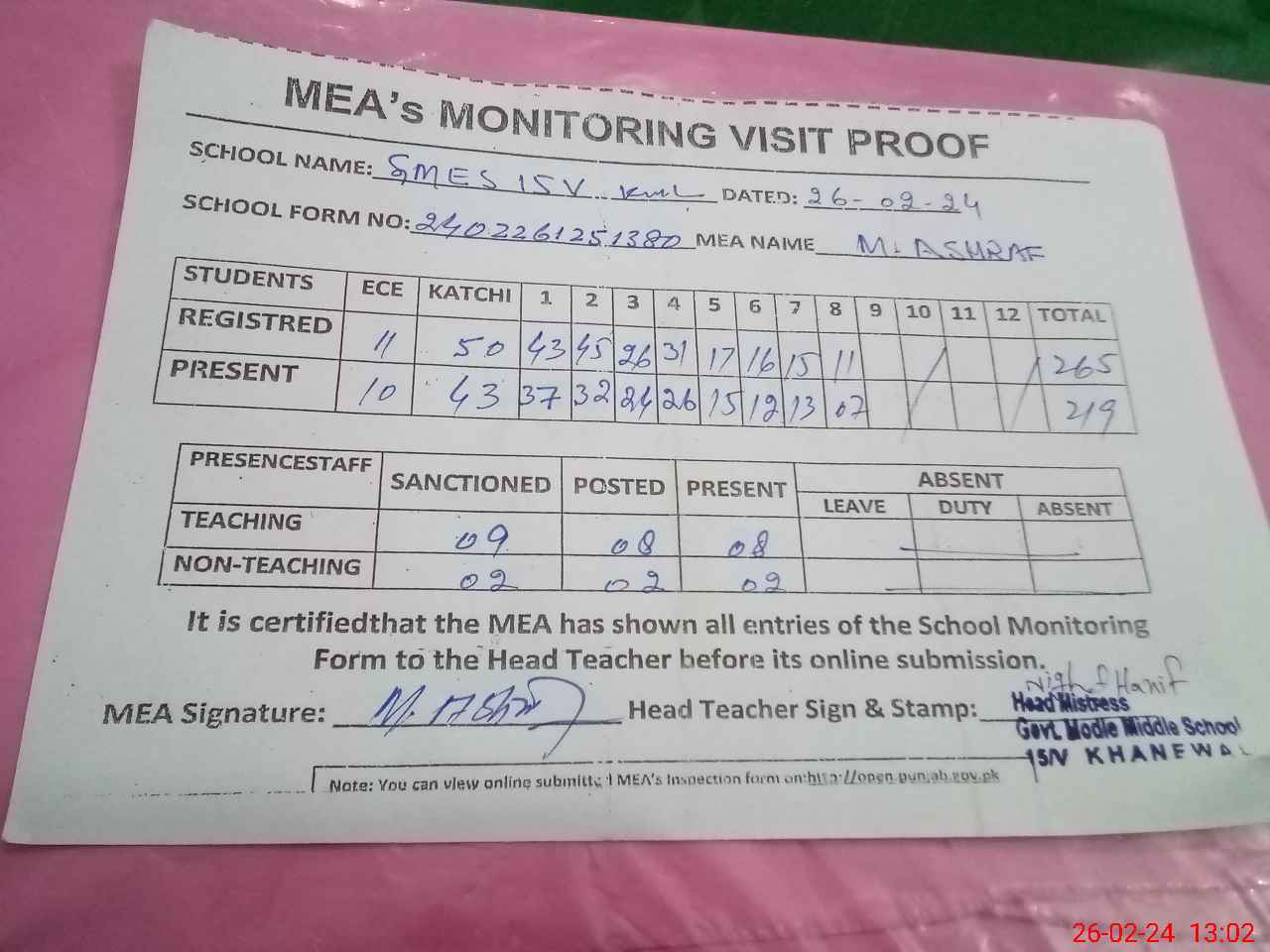 | Attendance Register | Head Teacher | MEA with School | Visit Proof |