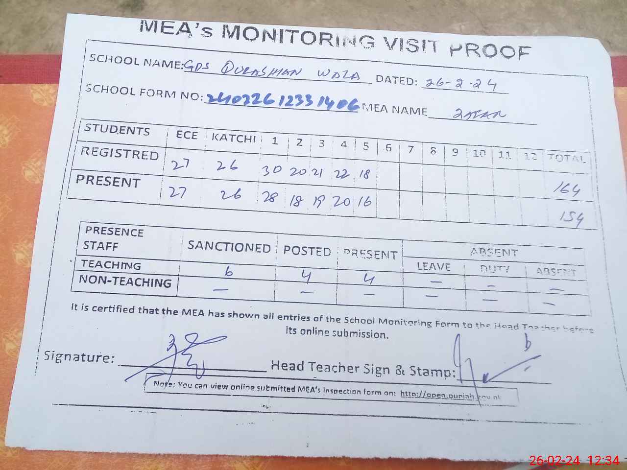 | Attendance Register | Head Teacher | MEA with School | Visit Proof |