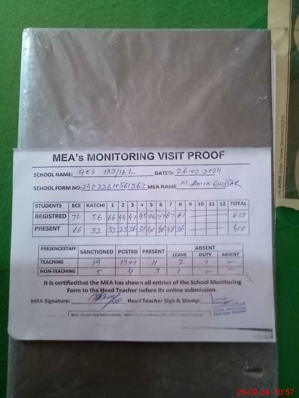 | Certified that this School was Inspected by the Undersigned MEA/DMO Today and the Information Stated Above is as Per Record. | |||||