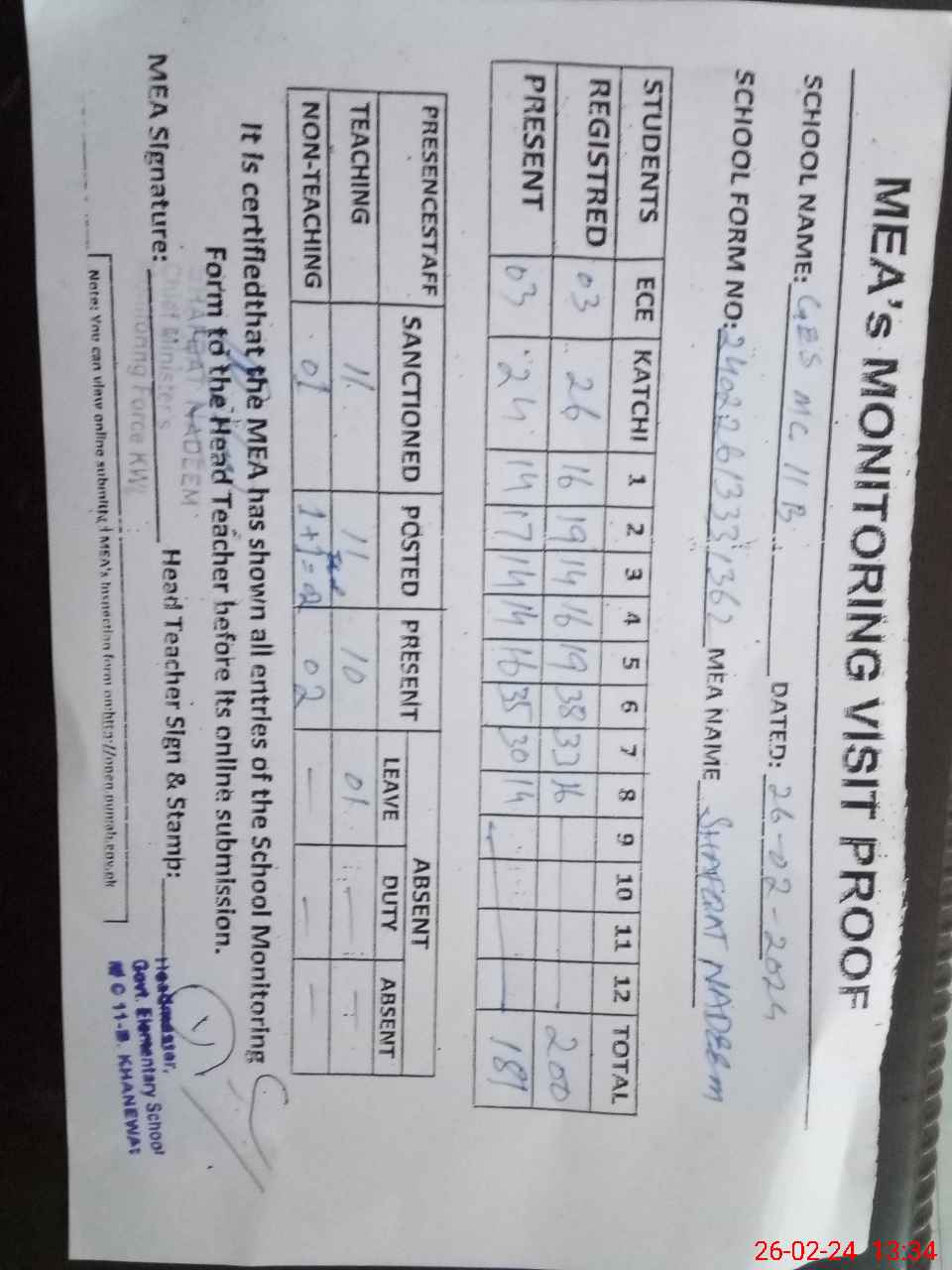 | Attendance Register | Head Teacher | MEA with School | Visit Proof |
