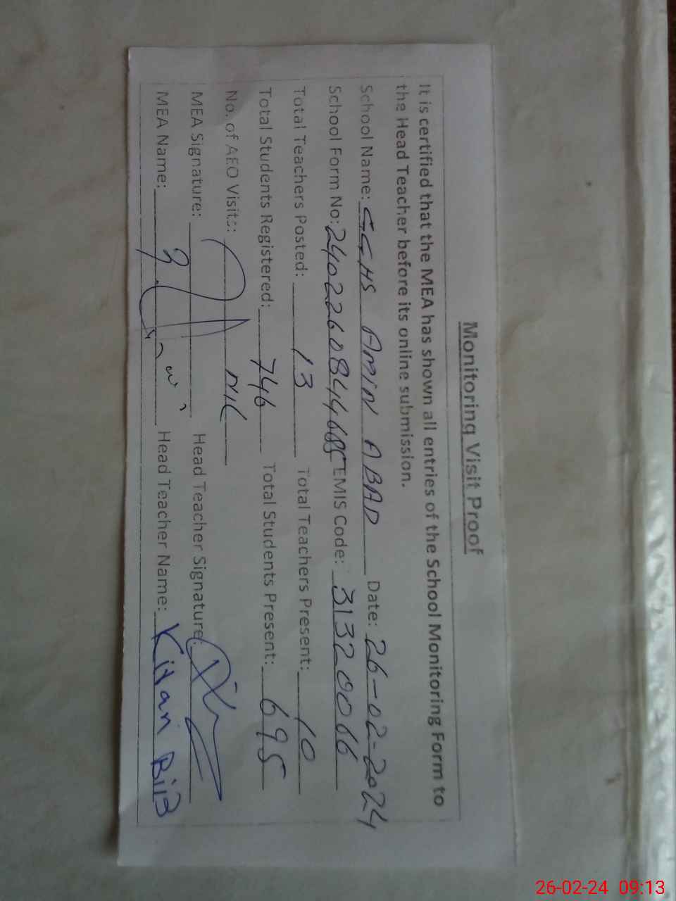 | Attendance Register | Head Teacher | MEA with School | Visit Proof |