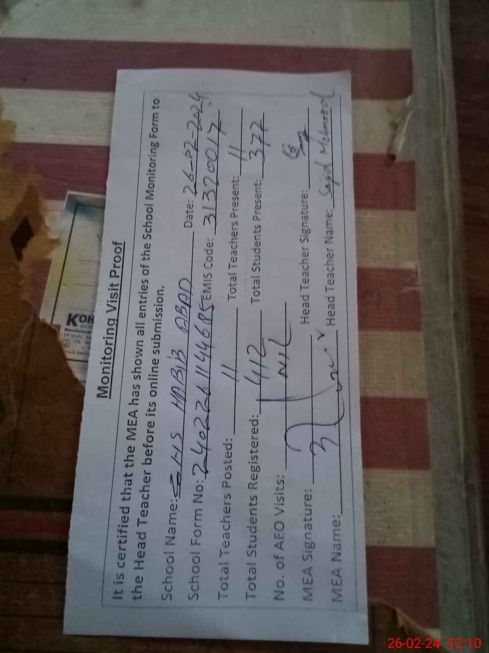| Certified that this School was Inspected by the Undersigned MEA/DMO Today and the Information Stated Above is as Per Record. | |||||
