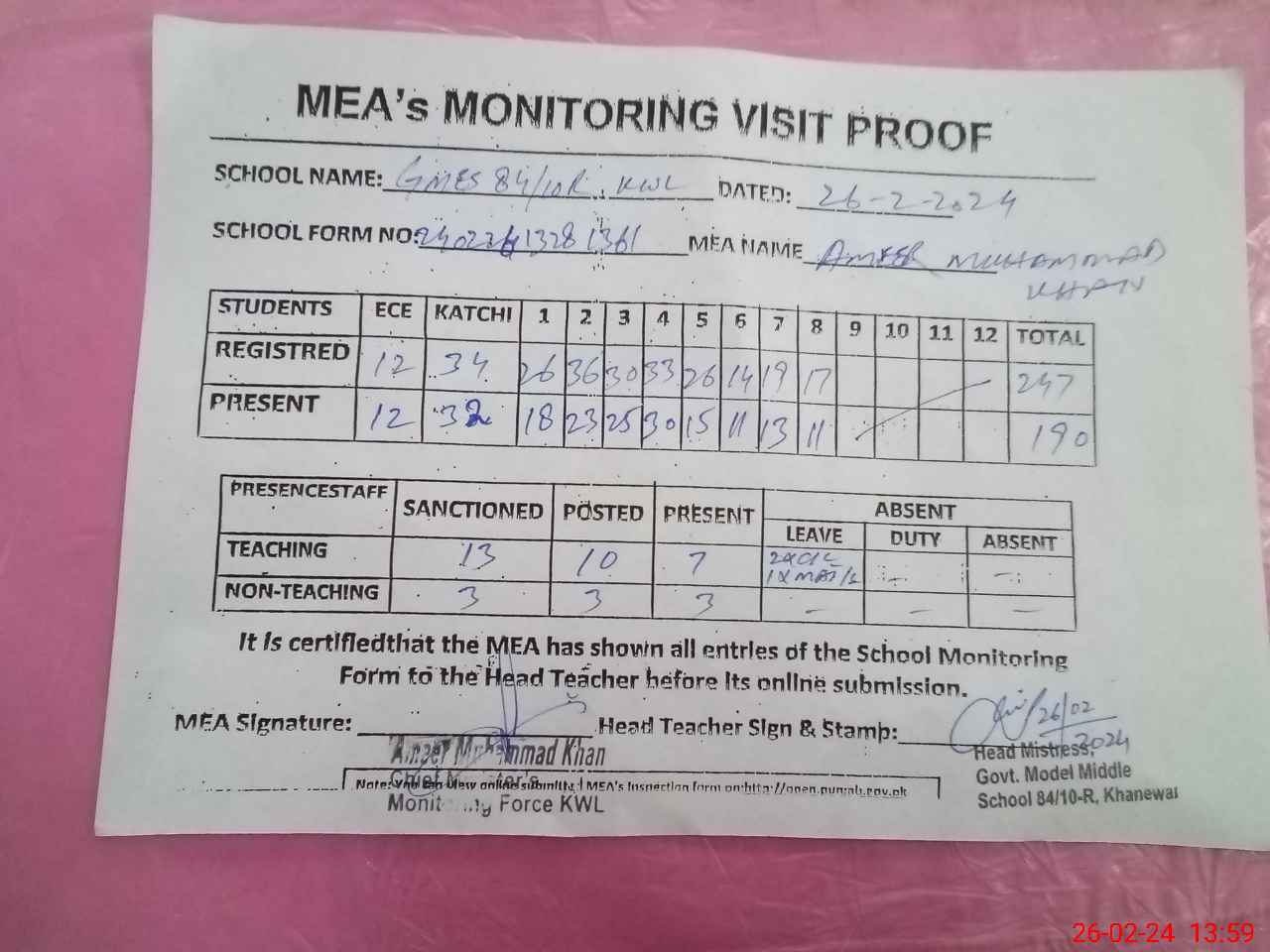 | EMIS Code: 36420426 | Name of School: GMES 84/10-R, KHANEWAL | |||