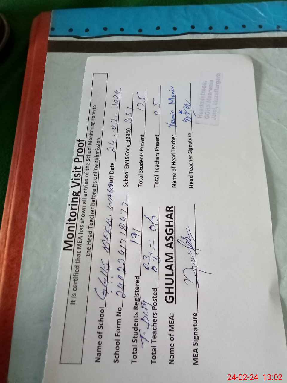 | Attendance Register | Head Teacher | MEA with School | Visit Proof |