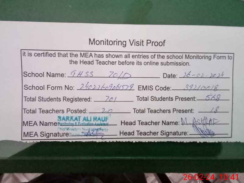 | Certified that this School was Inspected by the Undersigned MEA/DMO Today and the Information Stated Above is as Per Record. | |||||