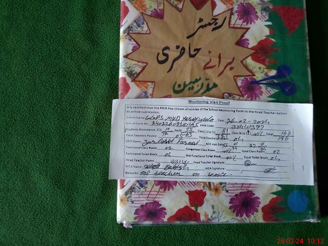 | Attendance Register | Head Teacher | MEA with School | Visit Proof |