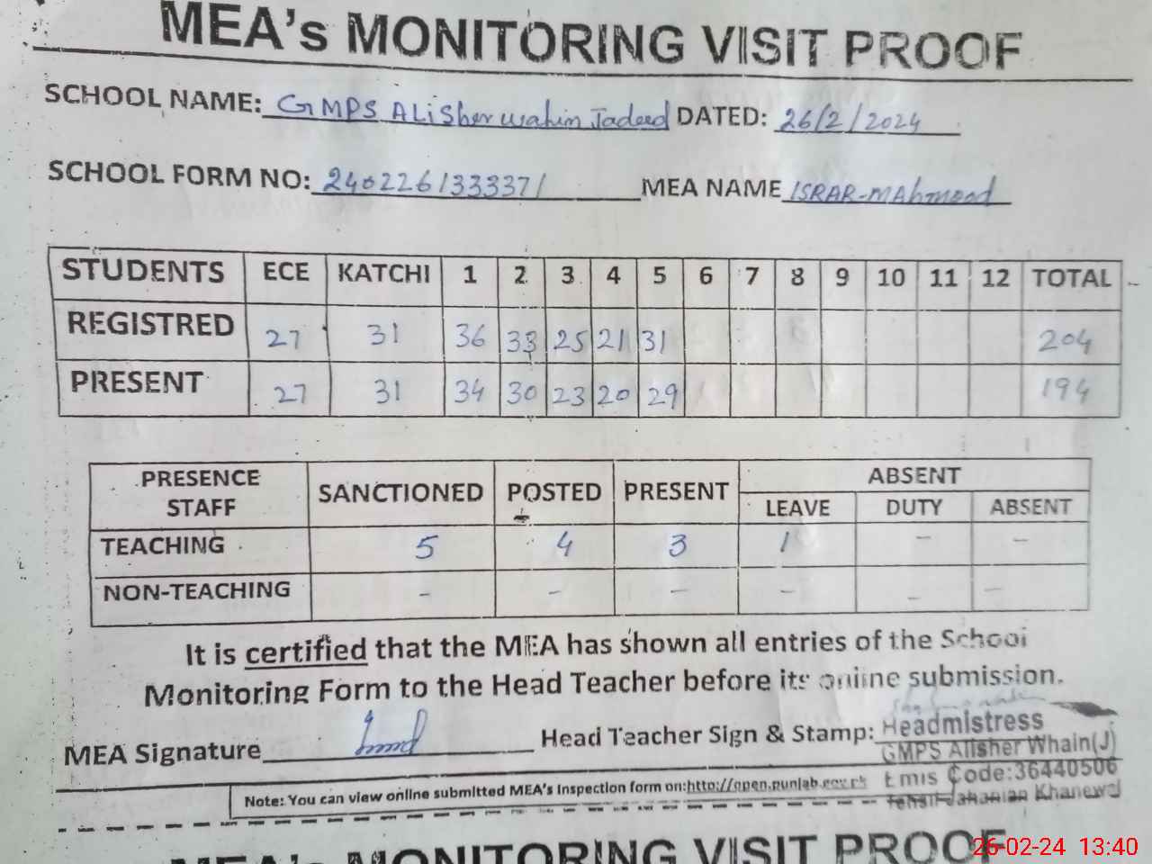 | Certified that this School was Inspected by the Undersigned MEA/DMO Today and the Information Stated Above is as Per Record. | |||||