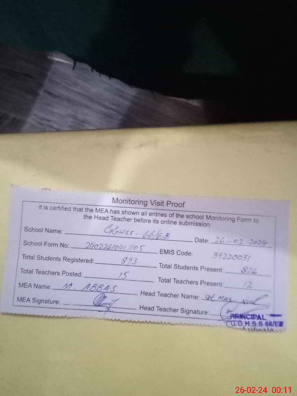 | Certified that this School was Inspected by the Undersigned MEA/DMO Today and the Information Stated Above is as Per Record. | |||||