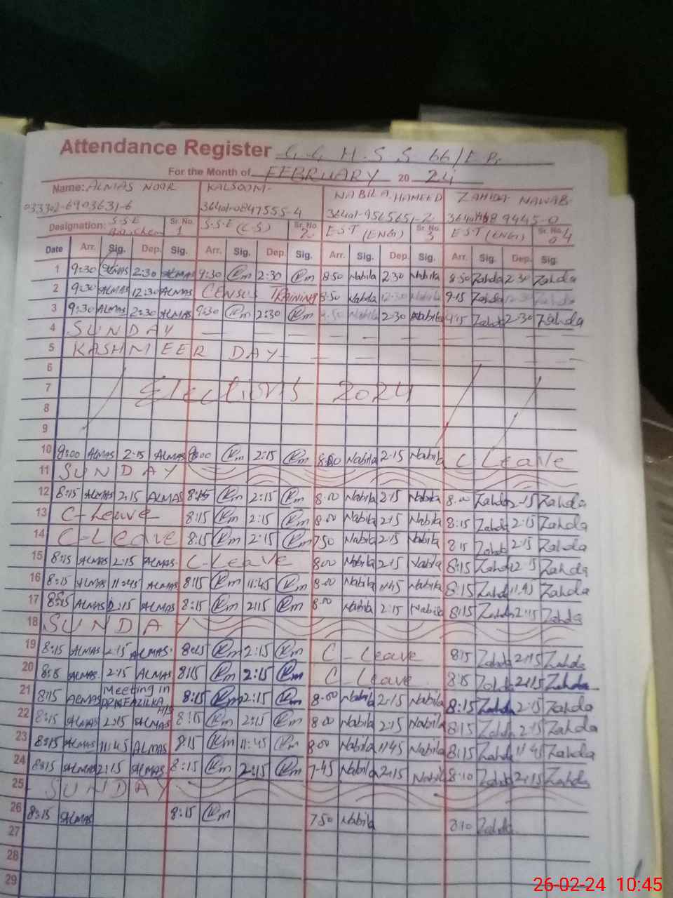 | CNIC | Full Name | Designation | R/C | Absence During Last Calender Month |
