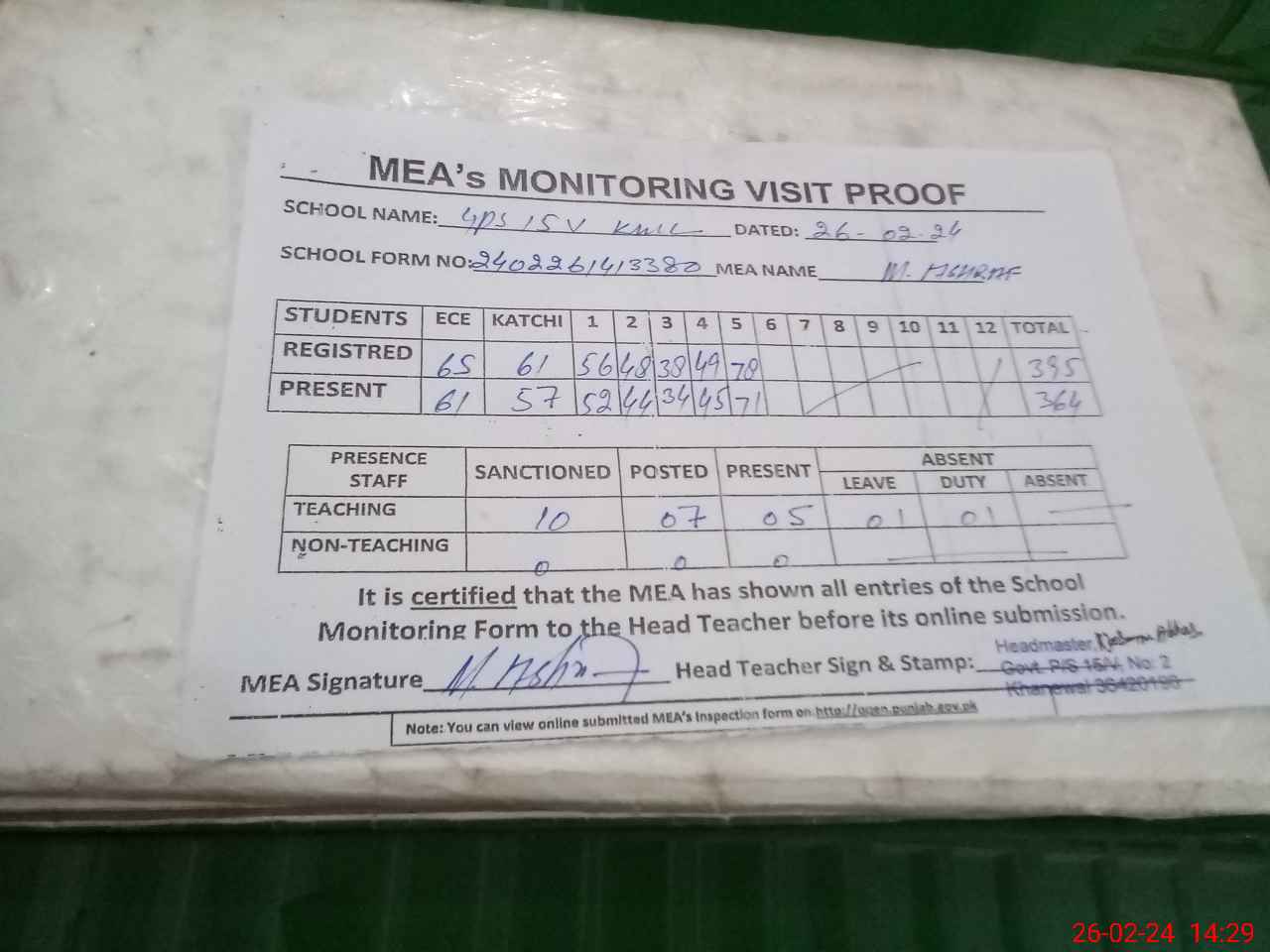 | Certified that this School was Inspected by the Undersigned MEA/DMO Today and the Information Stated Above is as Per Record. | |||||