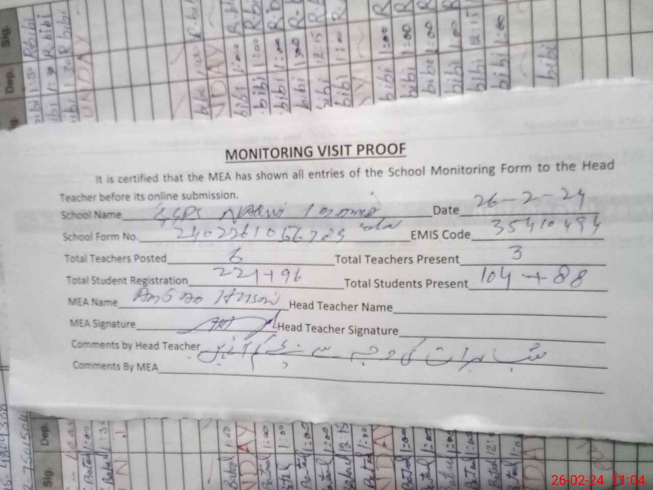 | Attendance Register | Head Teacher | MEA with School | Visit Proof |