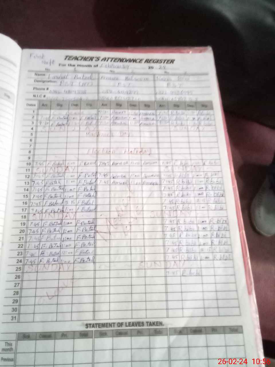 | CNIC | Full Name | Designation | R/C | Absence During Last Calender Month |