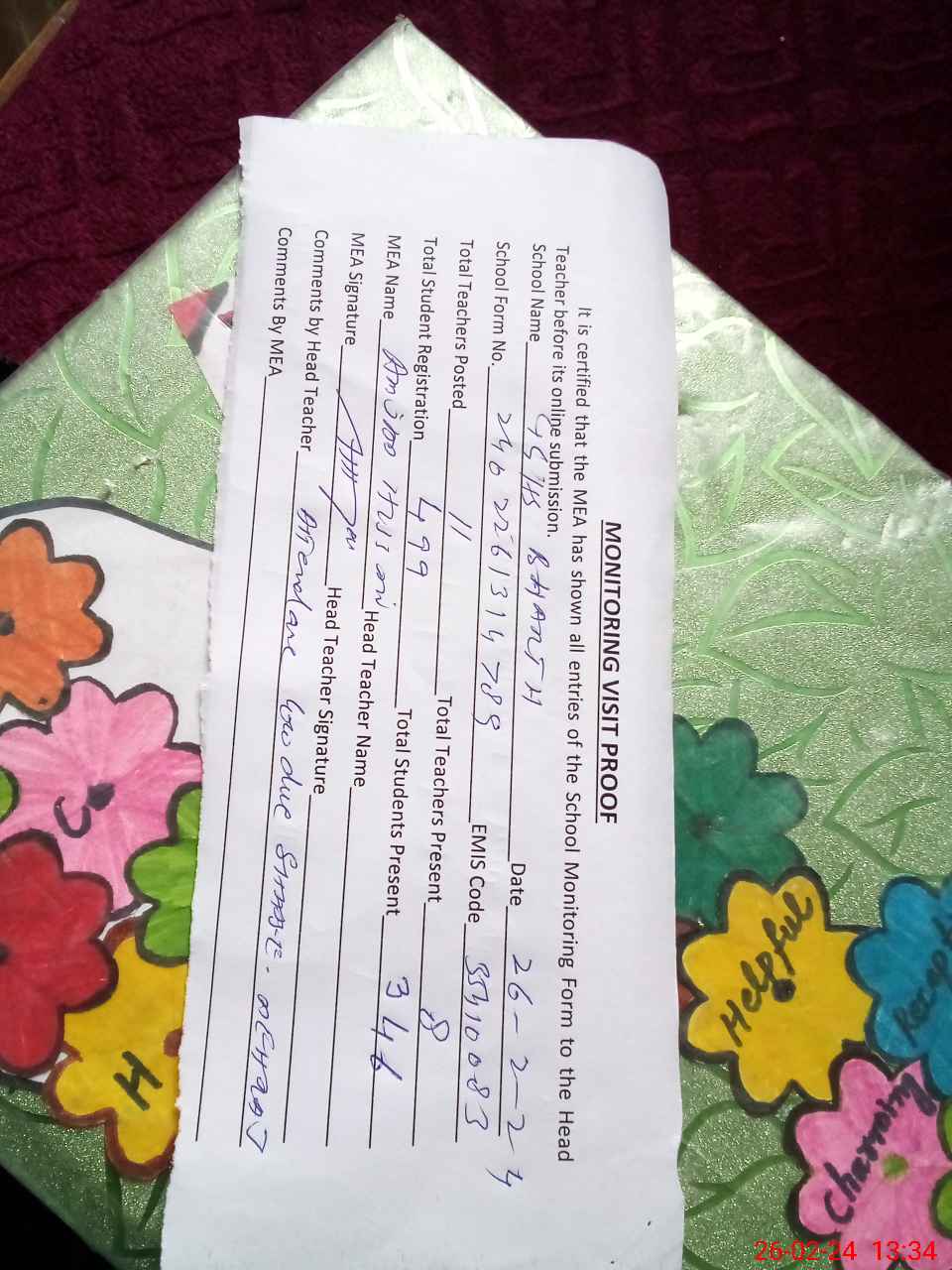 | Attendance Register | Head Teacher | MEA with School | Visit Proof |