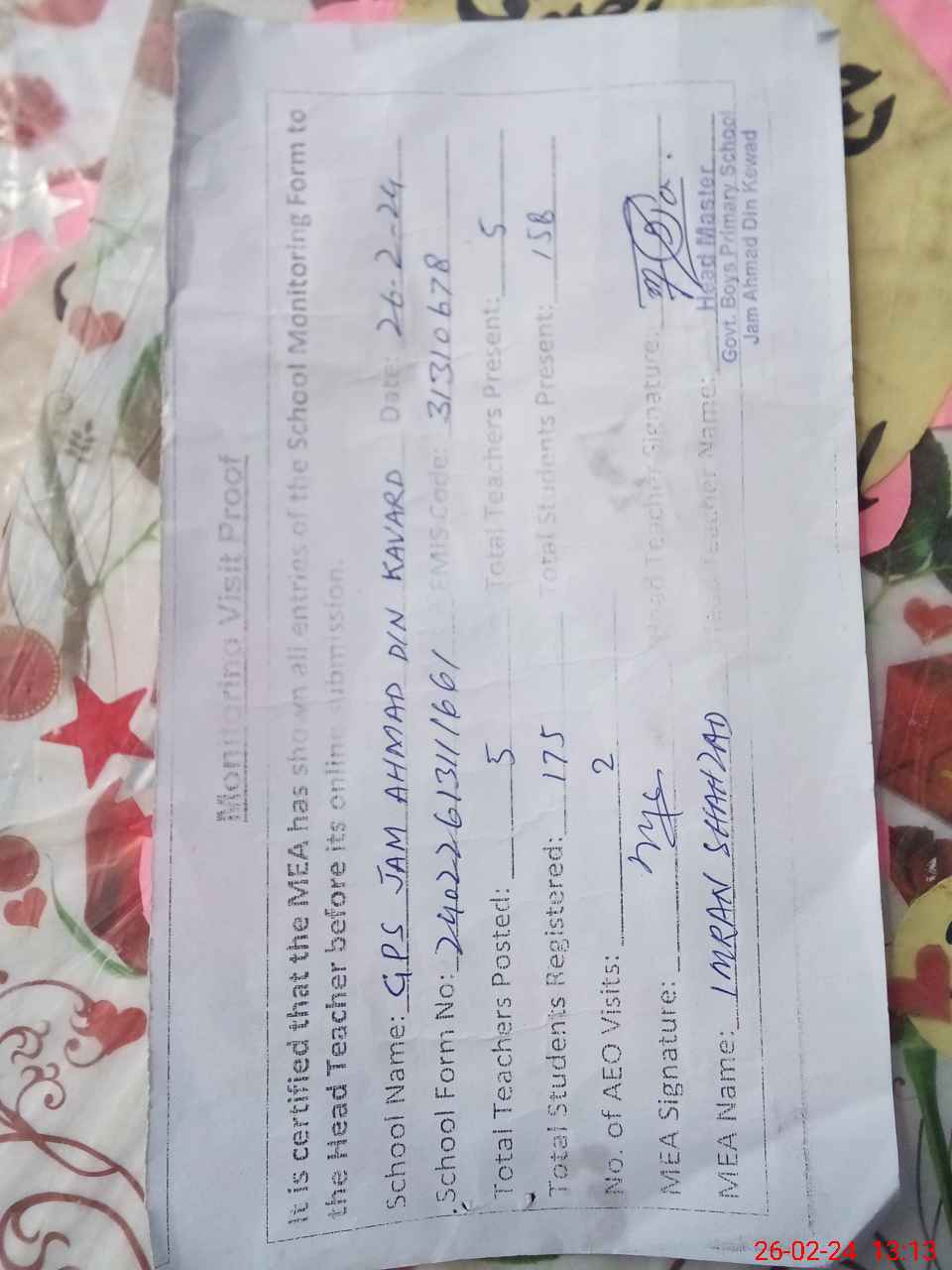 | Certified that this School was Inspected by the Undersigned MEA/DMO Today and the Information Stated Above is as Per Record. | |||||