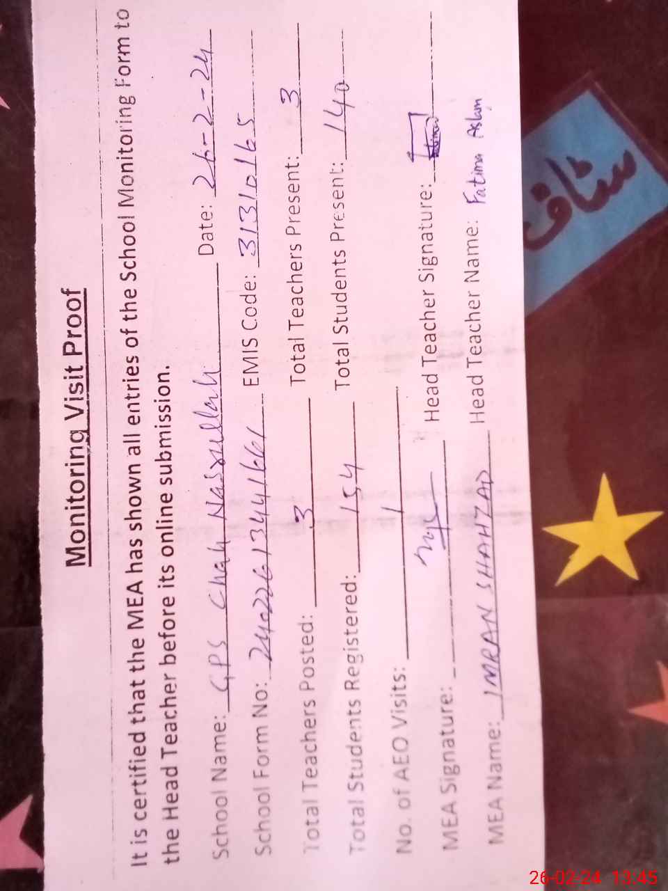 | Attendance Register | Head Teacher | MEA with School | Visit Proof |