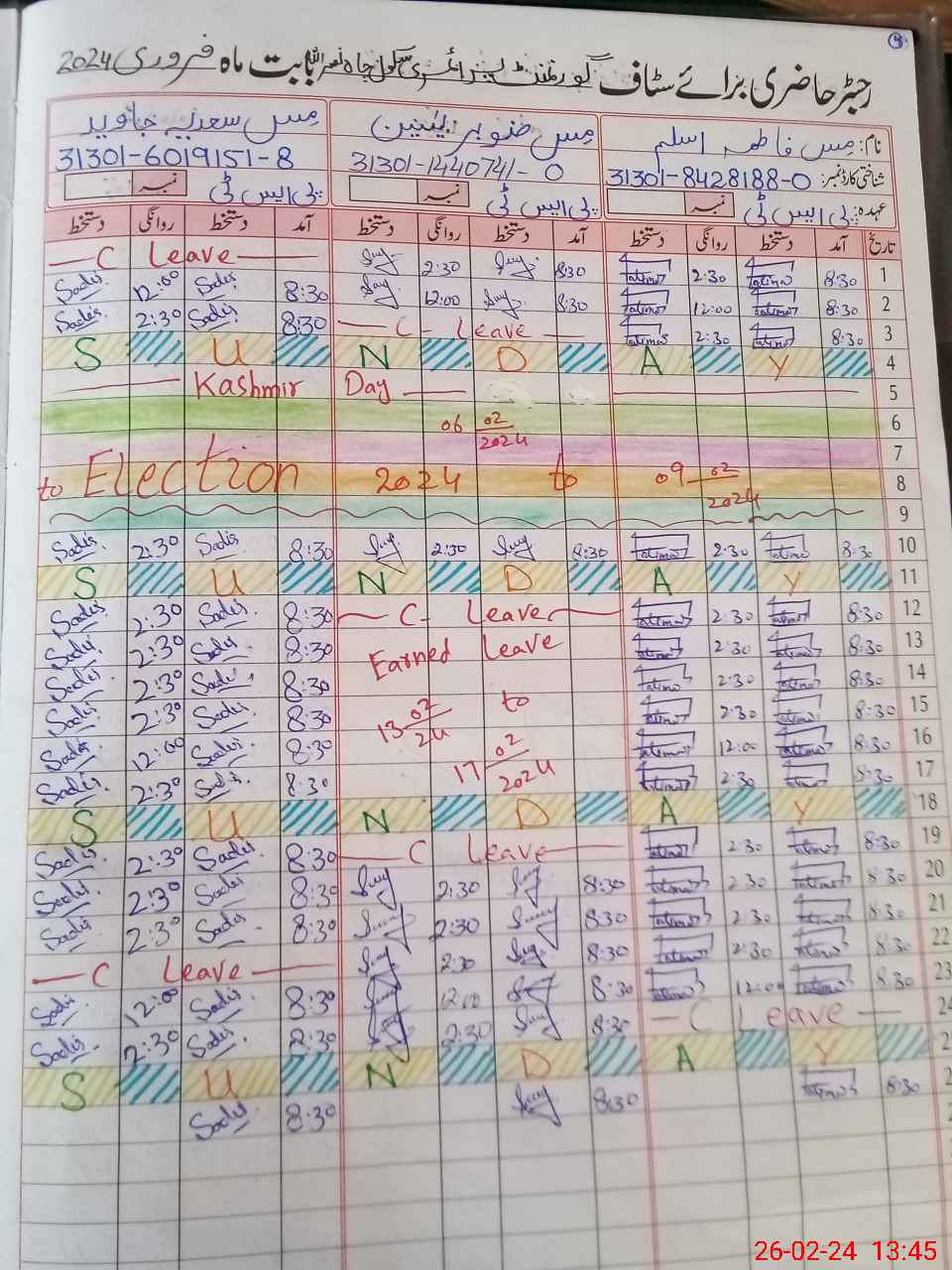 | CNIC | Full Name | Designation | R/C | Absence During Last Calender Month |