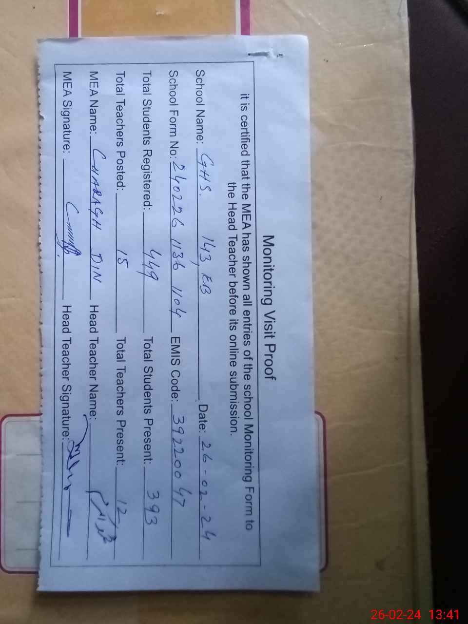 | EMIS Code: 39220047 | Name of School: GHS 143 EB PO 143 EB | |||