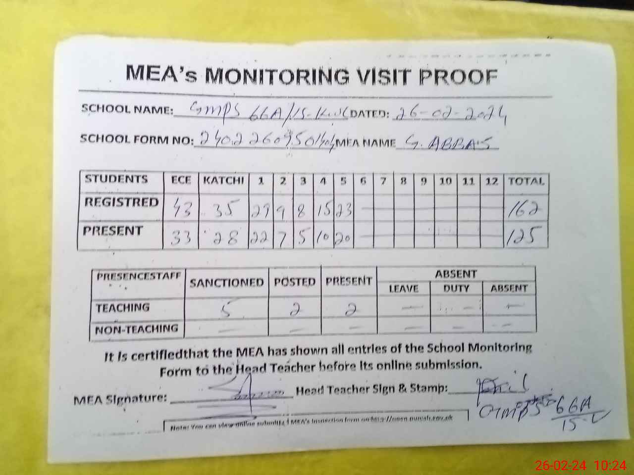| Attendance Register | Head Teacher | MEA with School | Visit Proof |