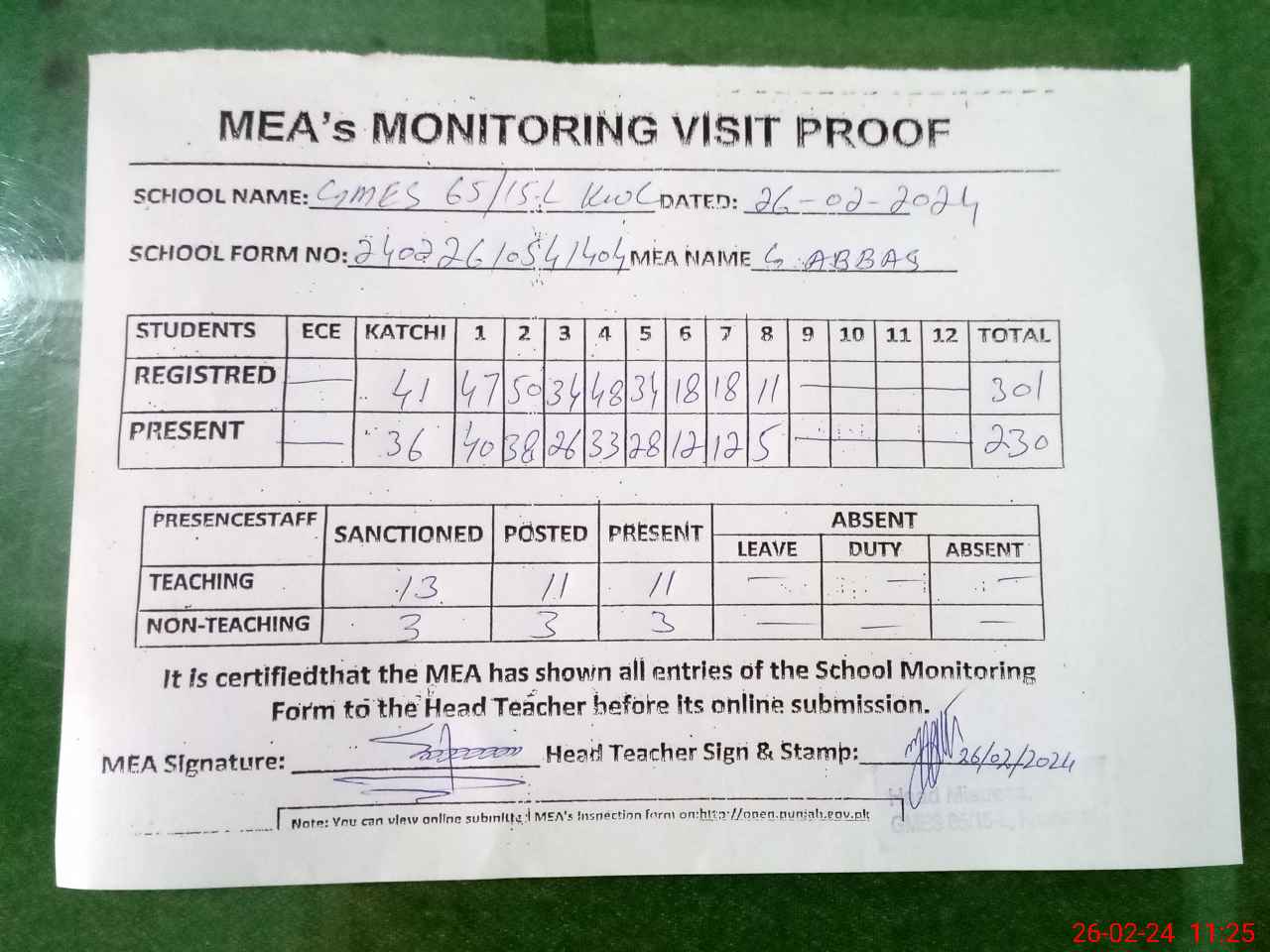 | Attendance Register | Head Teacher | MEA with School | Visit Proof |