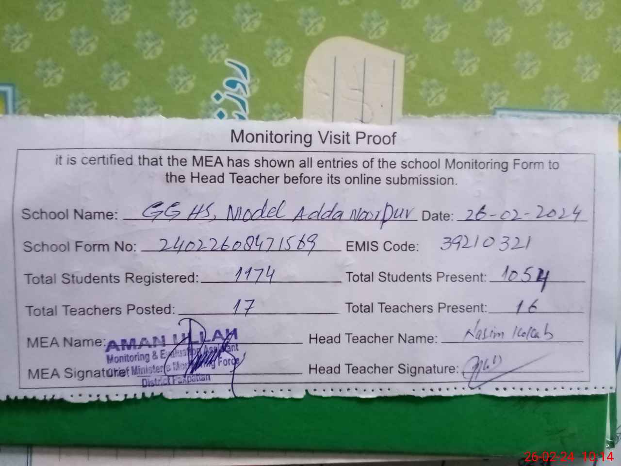 | Certified that this School was Inspected by the Undersigned MEA/DMO Today and the Information Stated Above is as Per Record. | |||||