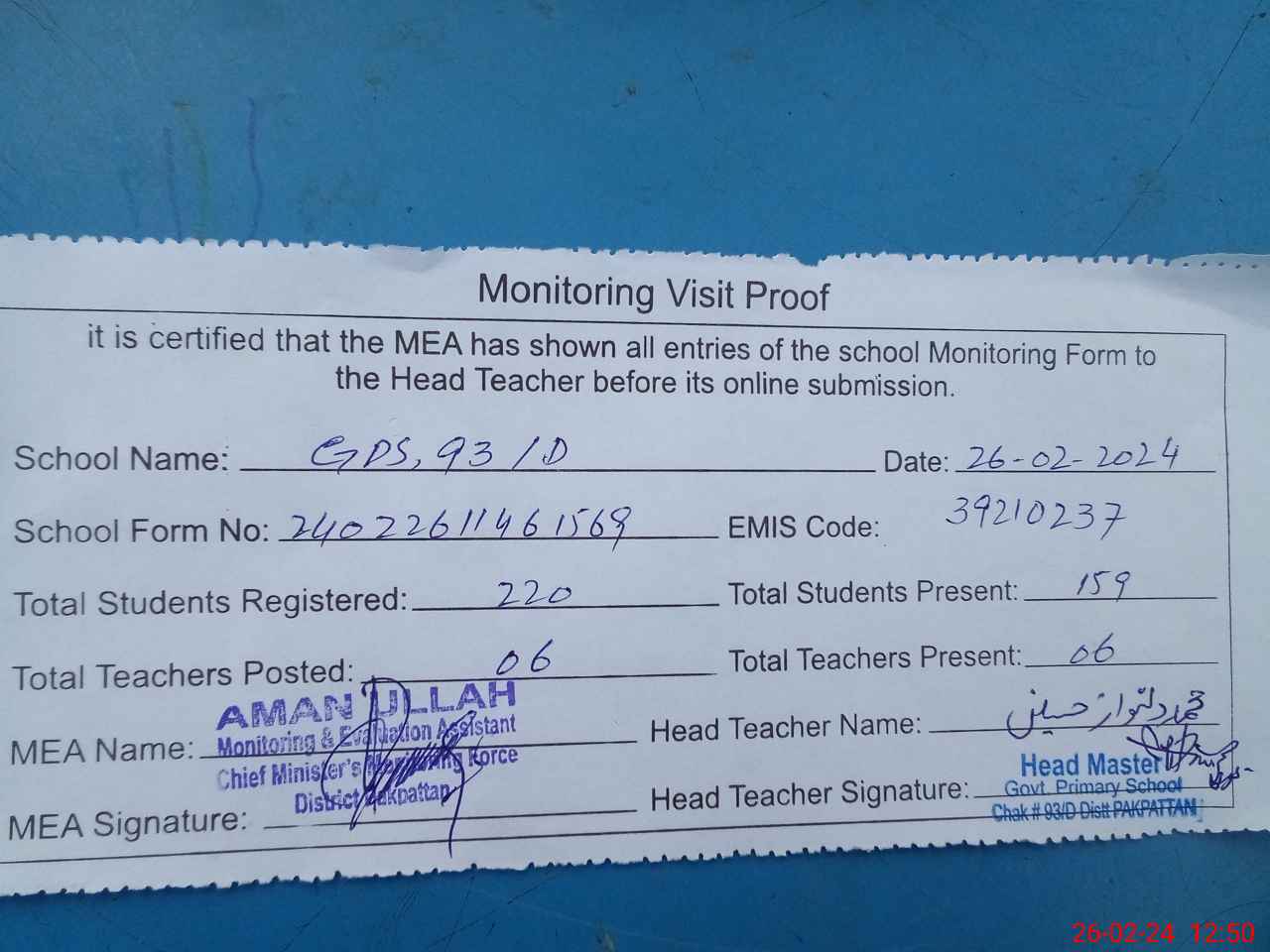| Attendance Register | Head Teacher | MEA with School | Visit Proof |