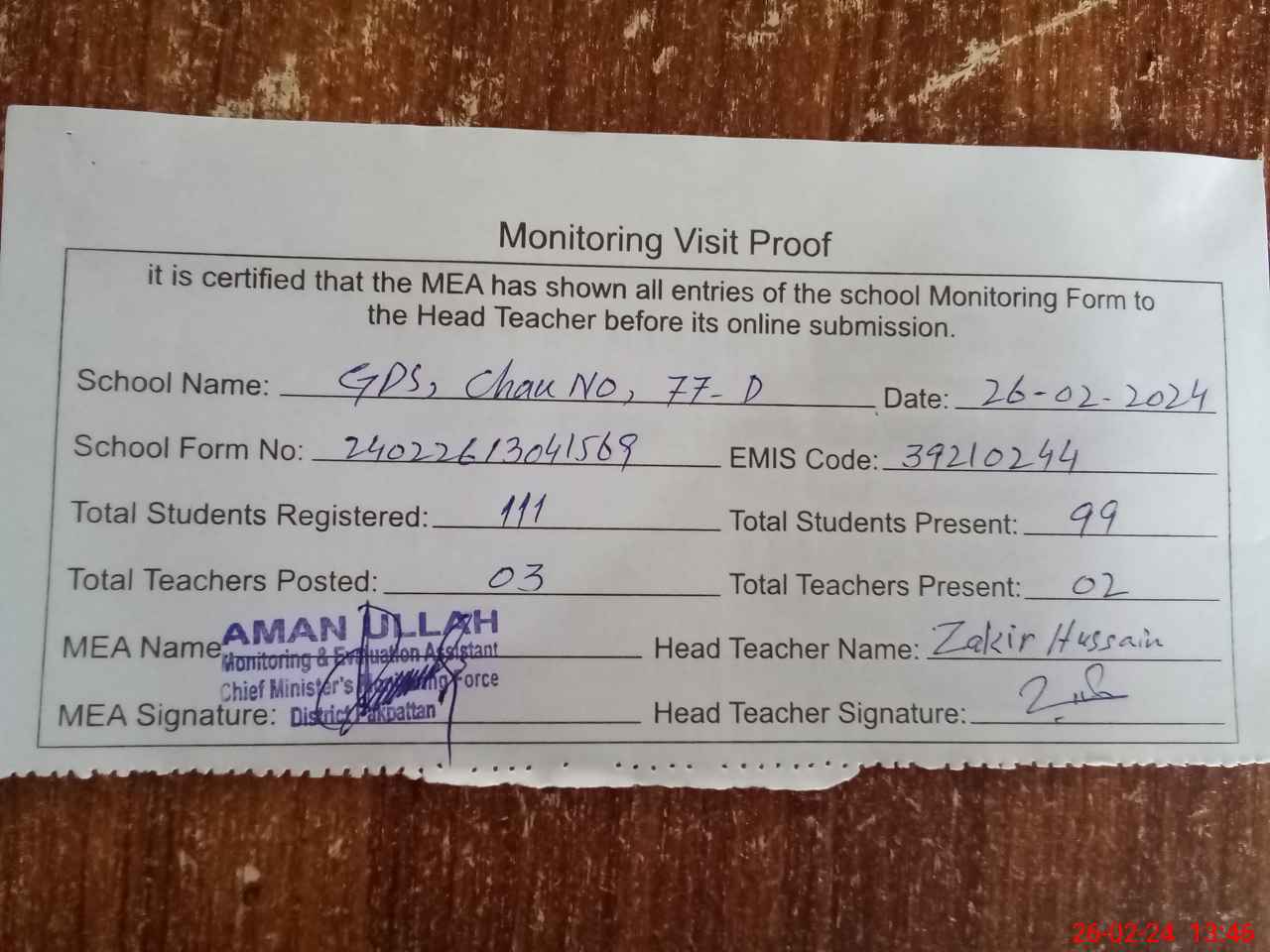 | Attendance Register | Head Teacher | MEA with School | Visit Proof |