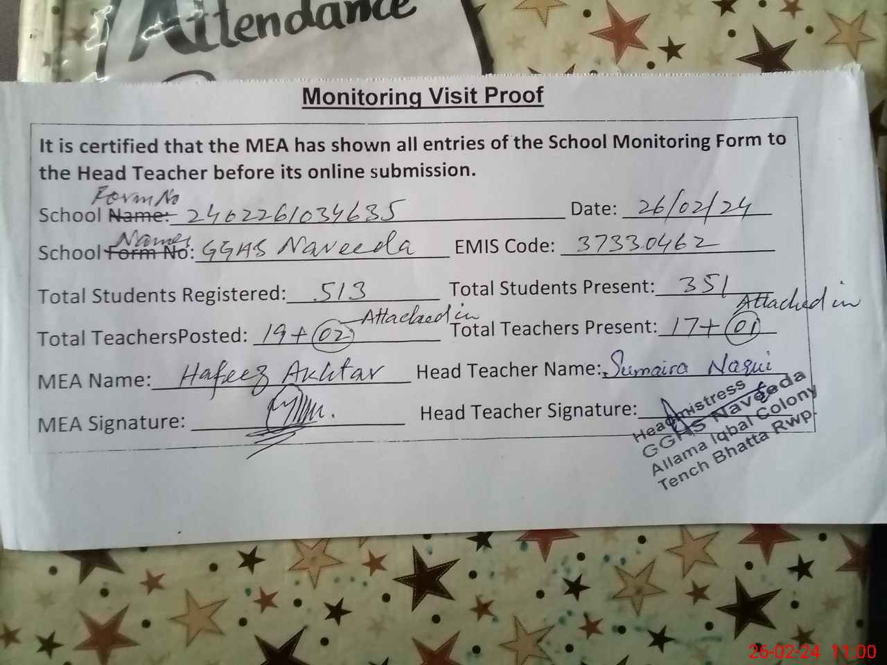 | Attendance Register | Head Teacher | MEA with School | Visit Proof |